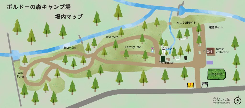 川が横を流れる林間サイトで雰囲気がすごく良い場所です。敷地内にtarosa collectionという手作り雑貨のお店があり、そこの店主さんが森を管理しています。