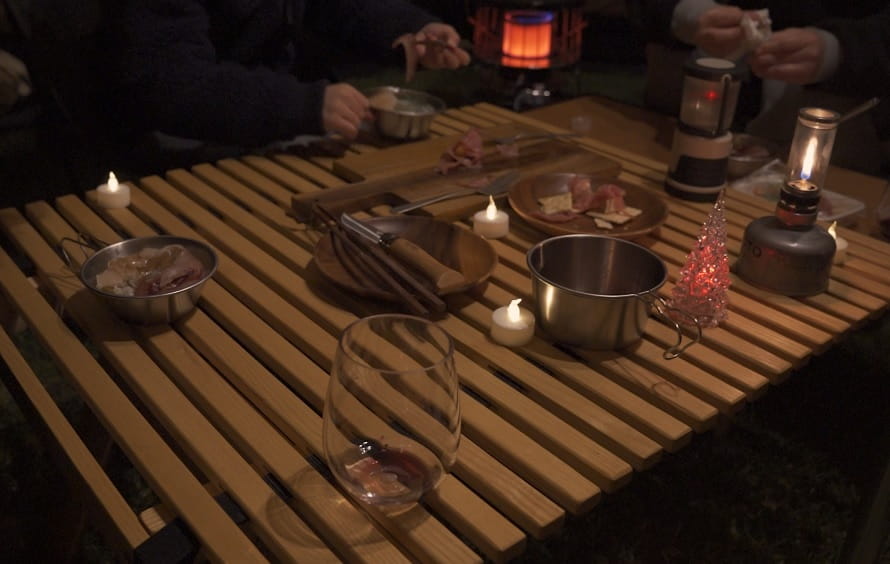 野外卓を使って朝食準備。
