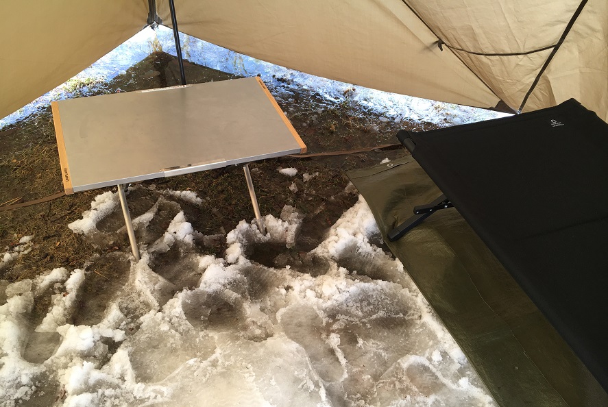なるべく雪の上に設営したい。でも雪は少ない。雪を運んでみたり、どけてみたり。四苦八苦。