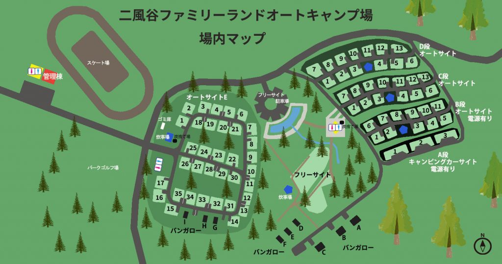 5つのオートサイトとバンガロー、フリーサイトによって構成され区画によって様々な特徴があります。一部山の傾斜地にサイトがありますが、それぞれ段々に整備されているので区画はすべて平坦です。